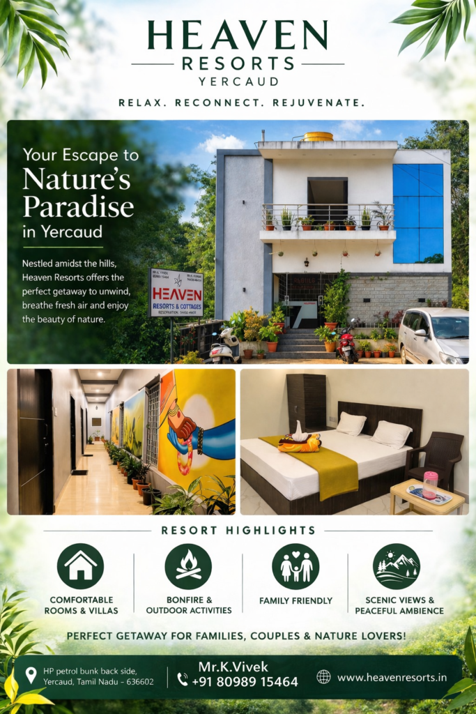 Yercaud is approximately 30 km from Salem city — about a 45 to 55 minute drive up the Shevaroy Hills. It is one of the closest hill stations to Salem, making it a perfect weekend getaway. Heaven Resorts provides pickup and drop service directly from Salem.